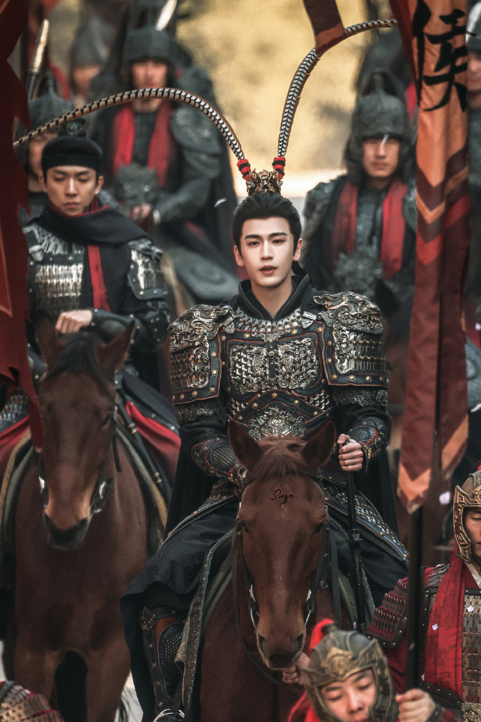 接近190cm的挺拔体态,配上跟着战马轰动的雉鸡翎。