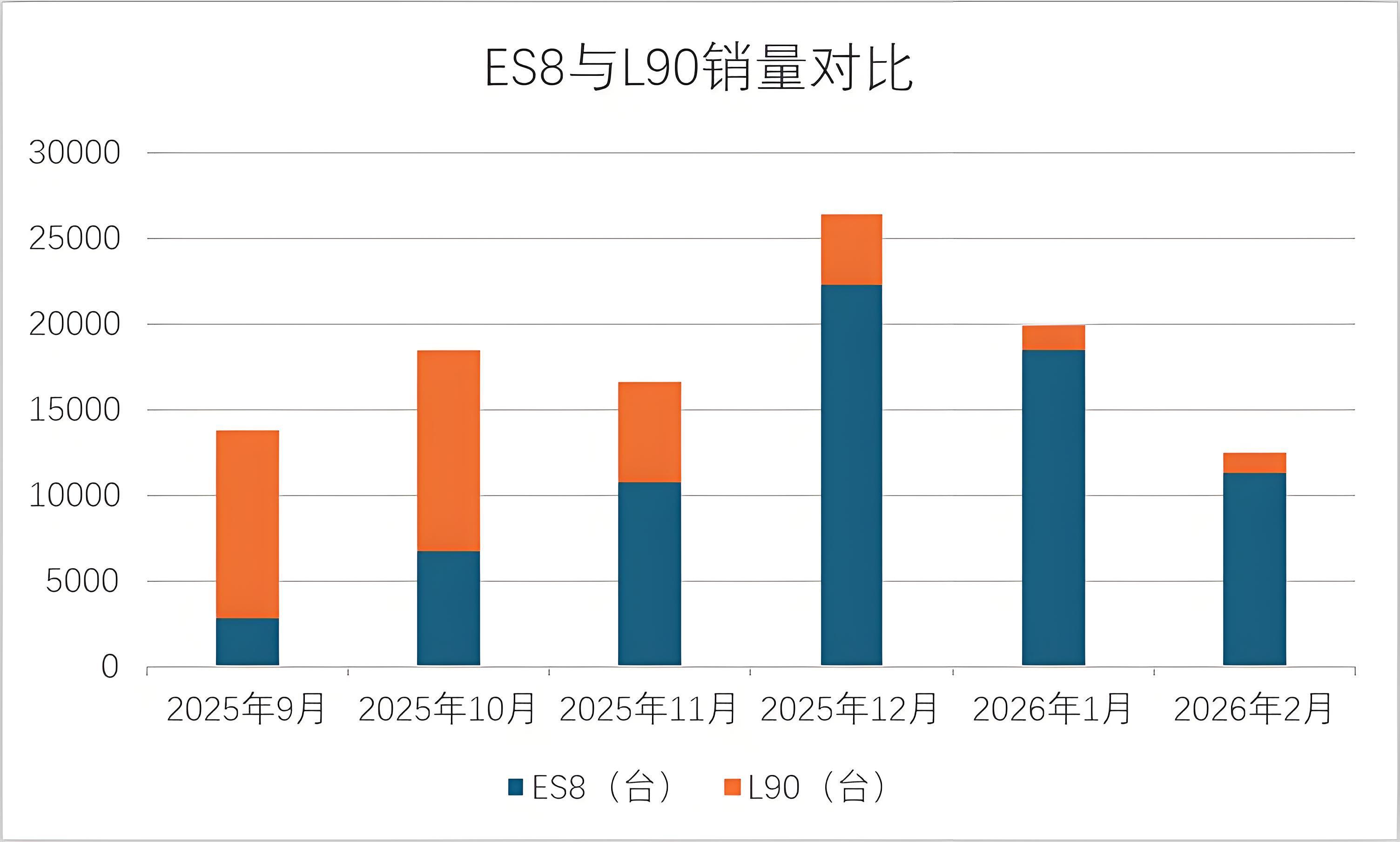 ▲图表说明:2026年2月未公布L90具体销量,证据乐说念品牌总销量2981台粗略臆想,占比四成约1200台,与1月相配,但具体数字不影响ES8远远压倒L90的趋势