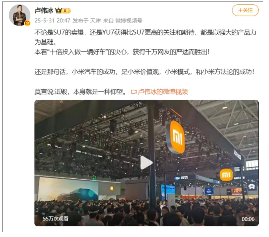 5月31日晚,小米集归拢伙东说念主、总裁,小米品牌总司理卢伟冰发文,还附上了小米汽车展位东说念主山东说念主海挤不进去的视频。