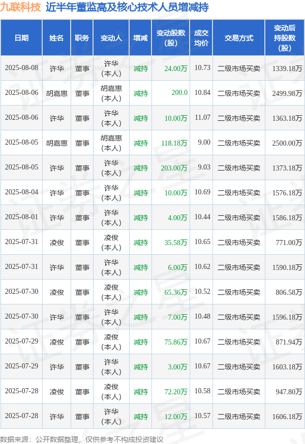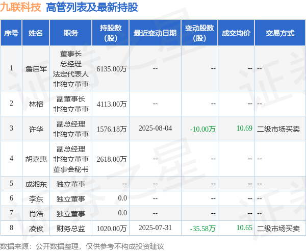 证券之星音问,字据8月12日阛阓公开信息、上市公司公告及交游所表现数据整理,九联科技(688609)最新董监高及联系东谈主员股份变动情况:2025年8月8日公司董事许华共减捏公司股份24.0万股,占公司总股本为0.048%。变动时候公司股价着落1.29%现金九游体育app平台,8月8日当日收盘报10.75元。
